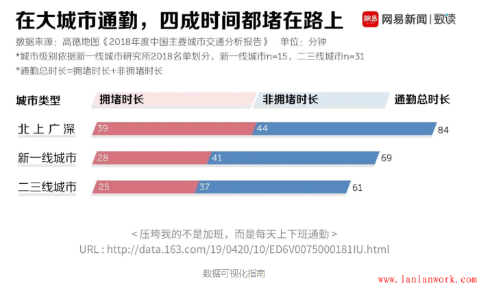 下圖是大城市通勤的時(shí)長(zhǎng)統(tǒng)計(jì),通過這些柱狀圖,我們能很清晰的看出各個(gè)級(jí)別的城市通勤時(shí)長(zhǎng)的比例關(guān)系,并了解他們的擁堵時(shí)長(zhǎng)和非擁堵時(shí)長(zhǎng)分別是怎樣的情況。