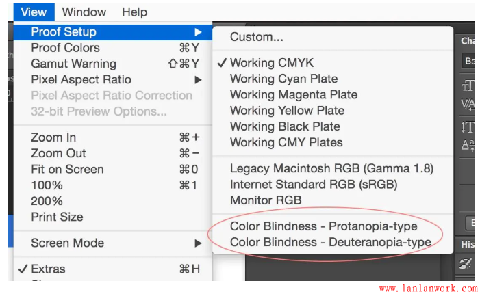 設(shè)計(jì)師常用的PS和AI提供了模擬紅色盲和綠色盲的校樣設(shè)置,選擇“視圖—校樣設(shè)置—紅色盲型/綠色盲型”。