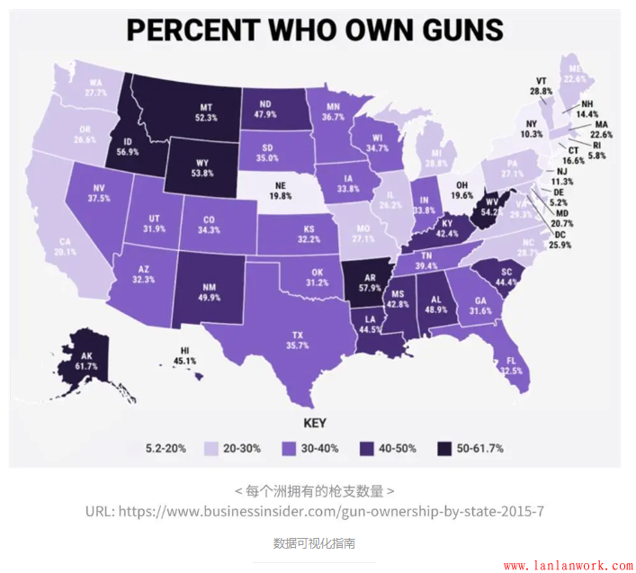 以下是美國(guó)各州擁有槍支人數(shù)占總?cè)藬?shù)的百分比統(tǒng)計(jì)圖。