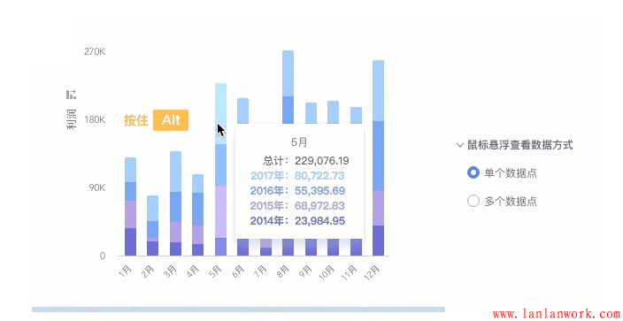 (1)輕量。眾所周知表格是可以承載數(shù)據(jù)的全面性,但將相同的數(shù)據(jù)用可視化展示時(shí),設(shè)計(jì)師總想將所有的信息堆砌在圖表上,顯得圖表非常笨重,因此增加了用戶的思考時(shí)間。在此建議明確你圖表類型的特點(diǎn),將主要信息呈現(xiàn)在圖表上或者分層展示圖表,比如數(shù)據(jù)鉆取功能。