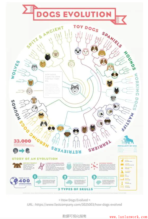 下圖是一張寵物狗的進(jìn)化圖,用巧妙的方式清晰地向我們傳遞了,狼是如何被人類馴化成不同種類的寵物狗的。