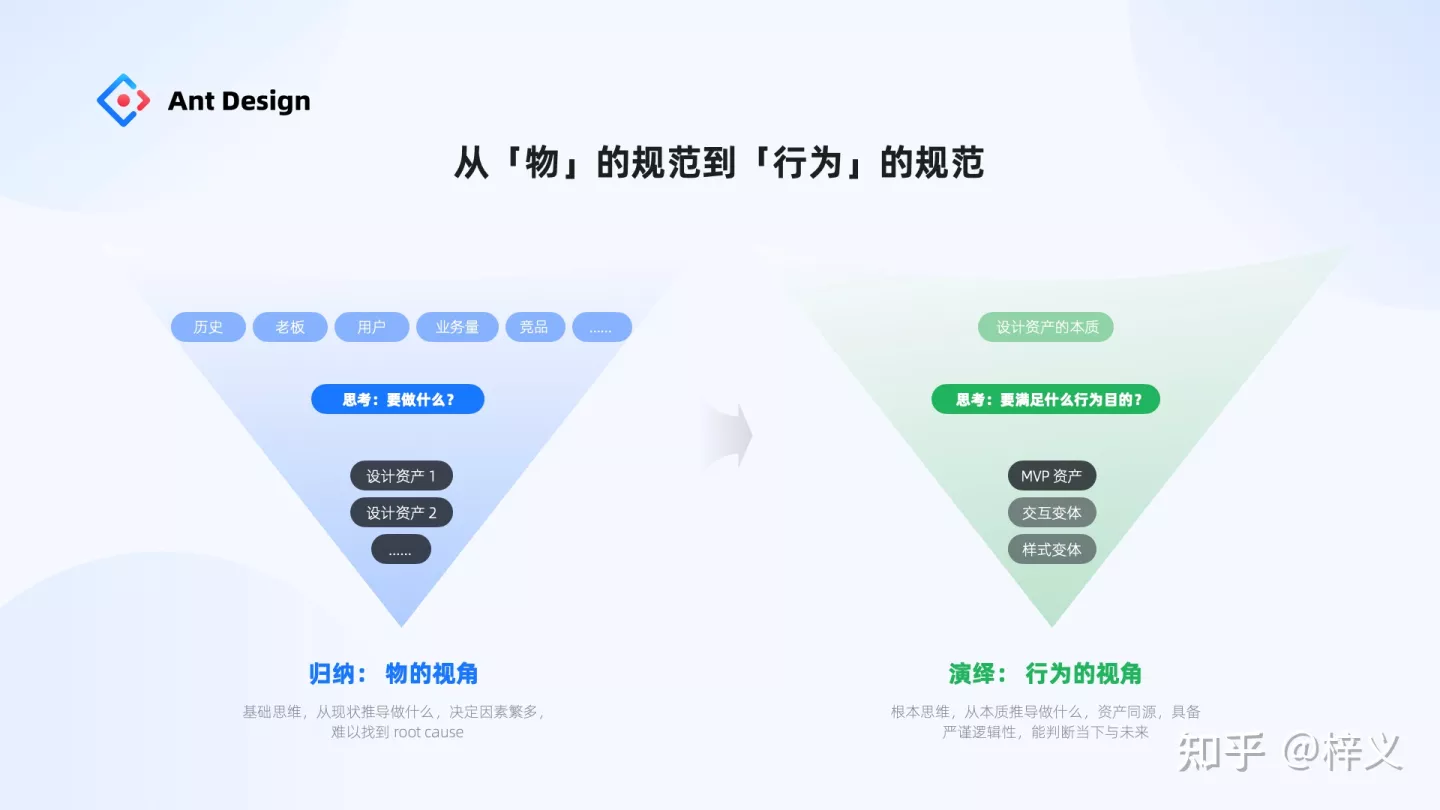 這時,我們要回歸本質,去源頭尋找組件建設的決策依據,一個確定的能讓團隊共識的決策依據。這個依據正是 ADM 所倡導的,將建設視角從歸納視角切換成演繹視角,認識到真正的設計規范不是「物的規范」而是「行為的規范」。演繹視角是一種探究本質的思維,這與“第一性原理”一樣,我們需要去尋根究底何為組件的本質。