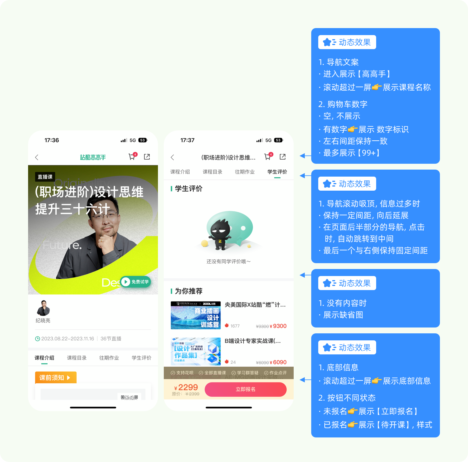 (4)動效信息標注,實現方式、觸發條件、持續時間、動畫路徑等