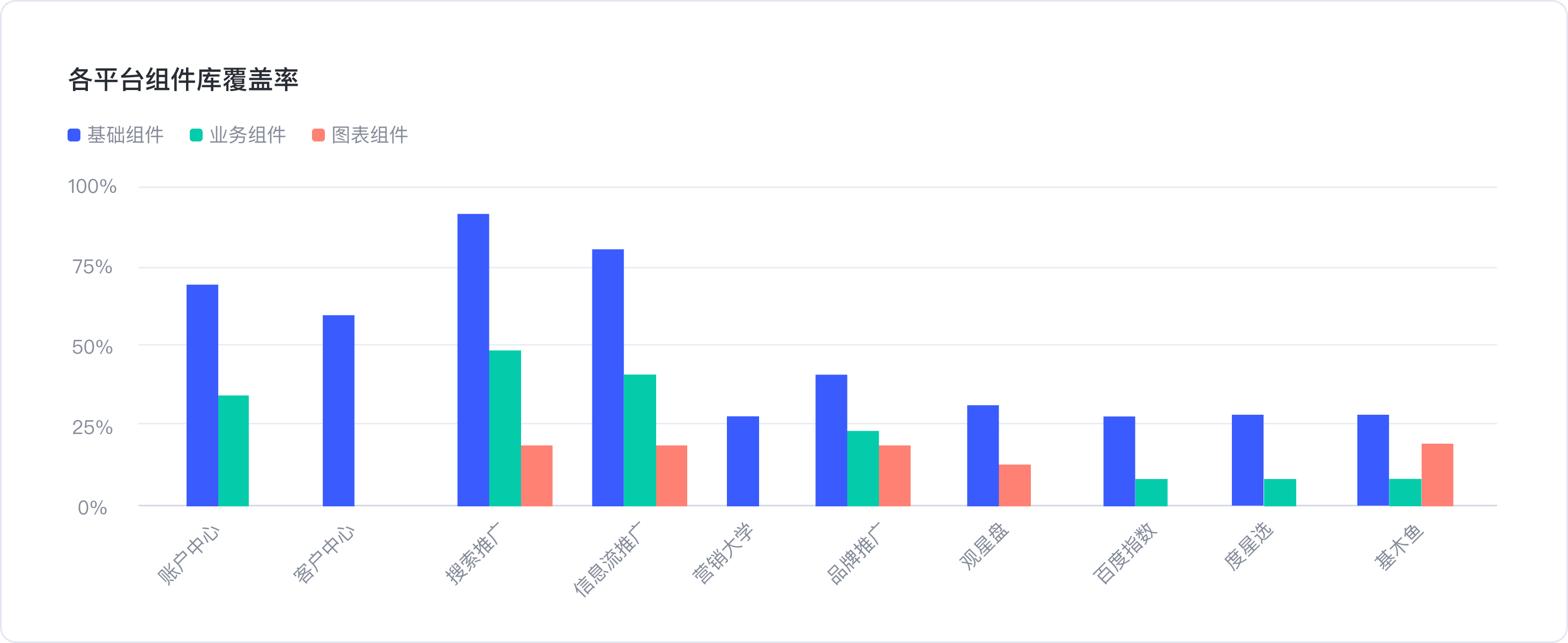 3.各平臺組件庫引用覆蓋-我們提供了基礎、業務、圖表3個大組件庫,從這個數據可以獲知各個業務平臺都引用了前述的哪些組件庫,以及各引用了多少組件。
