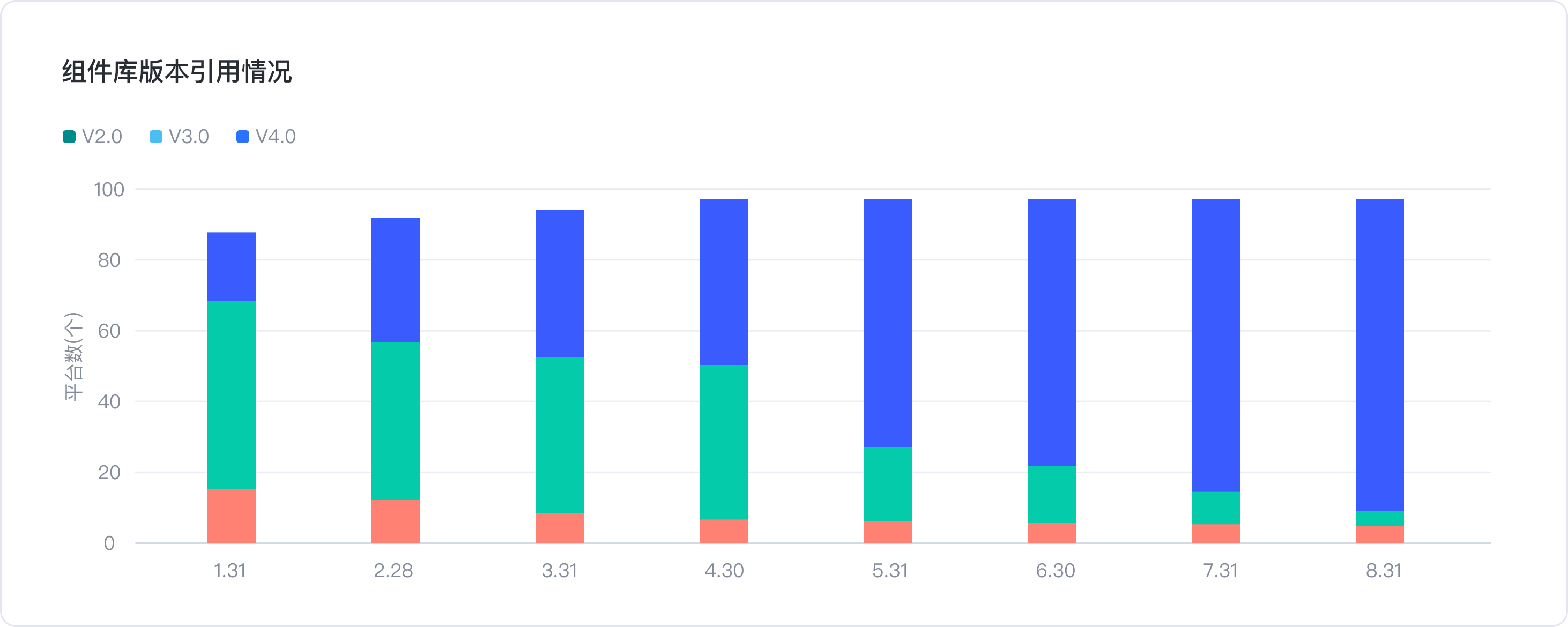 2.組件庫版本引用占比-各平臺引用的是哪個版本的組件庫(組件庫每升級一次,即為一個新版本)。