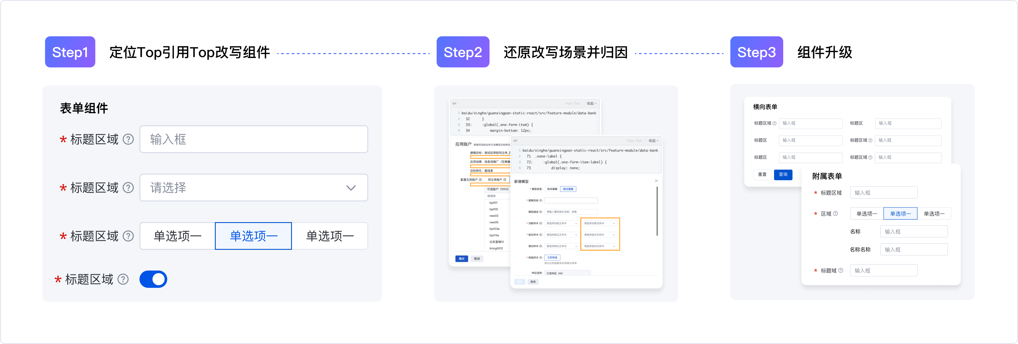 2.還原具體改寫場景并分類歸因:針對"表單"組件,拉取了改寫的css代碼,逐一分析都改寫了哪些樣式。從中提煉出共性的改寫場景,進行分類歸因。于是可以把表單組件的改寫問題分為4大類,分別是行間距問題、標簽寬度問題、橫向表單缺失問題、附屬表單樣式規范問題。