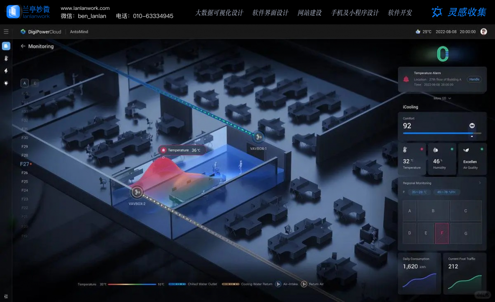 這是一套3D 場景化的智能樓宇管理系統,主打 “空間 + 設備 + 環境” 的一體化監控: 核心區域是樓宇內部的 3D 建模場景,用熱力圖(紅 / 藍)展示局部區域的溫度分布(如標注 “Temperature 35℃” 的熱點區域),同時呈現通風設備(VAVBOX)的位置與狀態; 右側面板整合 “溫度預警、制冷系統狀態、環境監測(溫濕度、空氣質量)” 等實時數據,支持區域切換、參數調節的交互操作; 底部展示 “冷卻水回路、空調系統” 的運行鏈路,適配樓宇運維人員對空間環境的精細化管理需求。