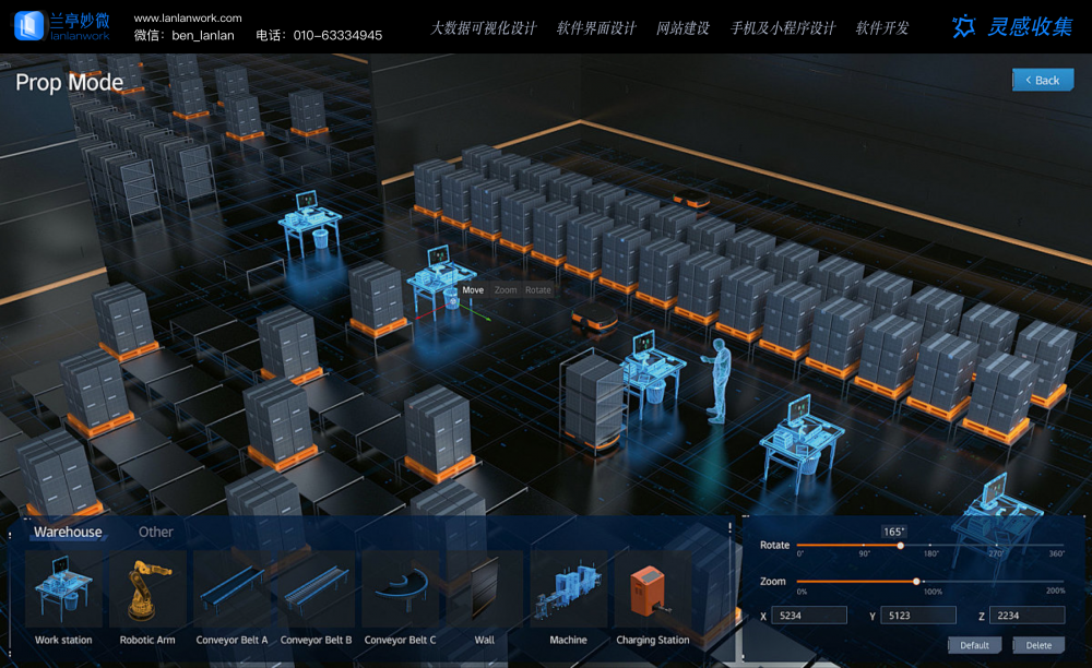 這是一套倉儲場景的 3D 可視化配置系統,主打 “空間布局的可視化編輯”: 核心區域是倉儲環境的 3D 建模場景,支持對工位、機械臂、傳送帶等設備進行 “移動、縮放、旋轉” 的交互操作,適配倉儲布局的規劃需求; 左側是 “設備組件庫”,提供工位、機械臂、傳送帶等可拖拽的倉儲元素; 右側是參數調節面板,支持精確設置設備的旋轉角度、縮放比例、空間坐標,同時提供 “默認、刪除” 的快捷操作,滿足倉儲規劃人員的精細化配置需求。