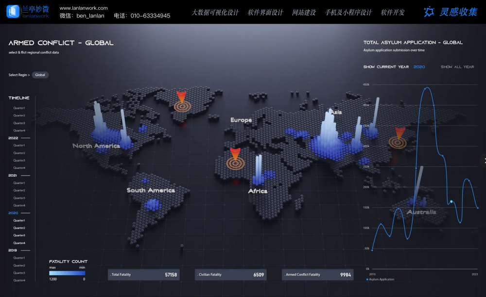 這是一套地理 + 時間維度的多維度數據可視化系統,聚焦全球沖突與難民數據: 核心區域是 “粒子化地球模型”,用不同高度的柱狀圖(藍色)展示各地區沖突傷亡分布,用橙色標識沖突熱點區域,直觀呈現地理維度的分布差異; 左側 “時間軸” 支持按季度篩選數據,右側折線圖展示 “全球避難申請” 的年度趨勢; 底部用數字卡片整合 “總傷亡、平民傷亡、武裝沖突傷亡” 的核心數據,同時用色階條標注傷亡數的 “最大 - 最小” 范圍,幫助用戶快速理解數據量級。
