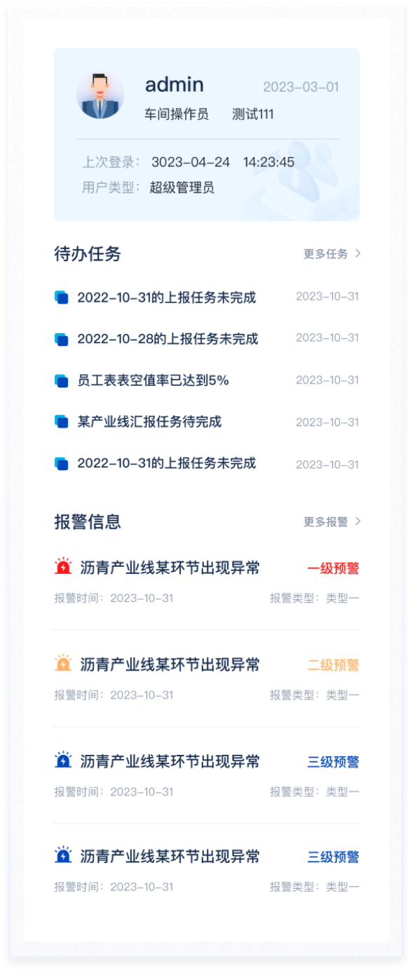 待辦任務是新增模塊,對于業務操作人員來講待辦事項是比較關注的內容,該模塊根據不同的業務人員展示不同的內容。